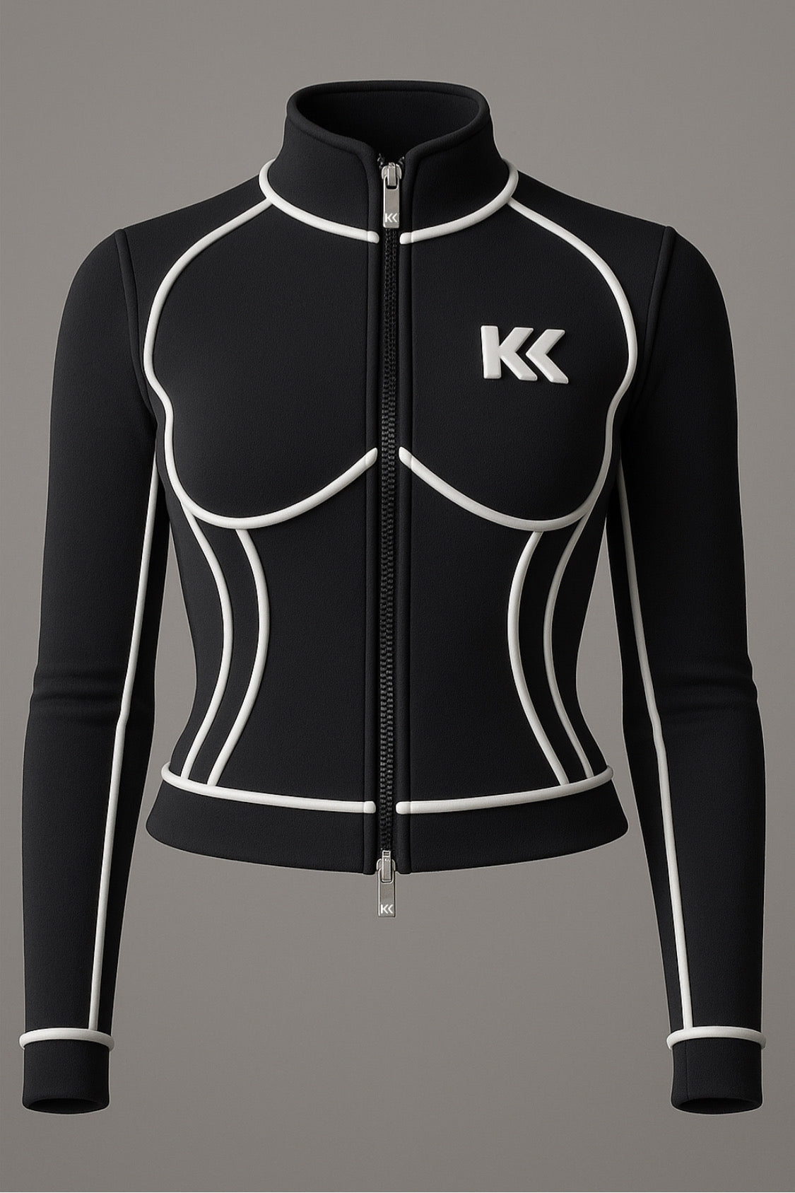 The contoured white piping design sculpts and enhances your silhouette, while the zip-front closure makes it easy to throw on before a workout or layer over your favorite athleisure fit. Featuring the bold KK logo on the chest, this jacket is more than just activewear—it’s a statement.